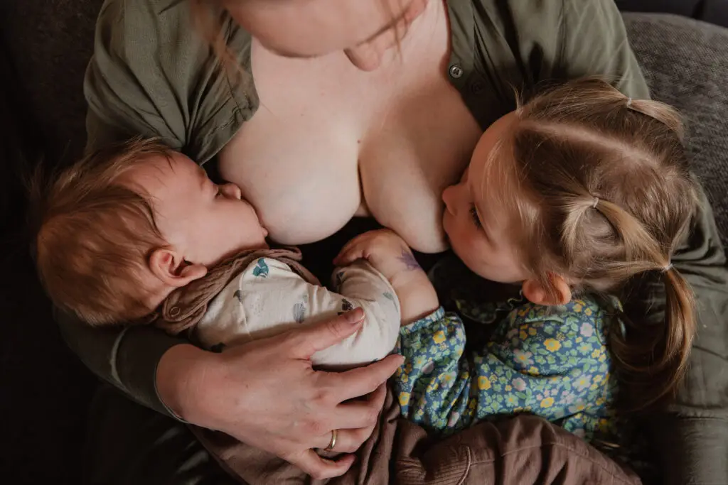 Eine Mutter sitzt mit drei Kindern auf der Couch und stillt ihr zwei jähriges Kind